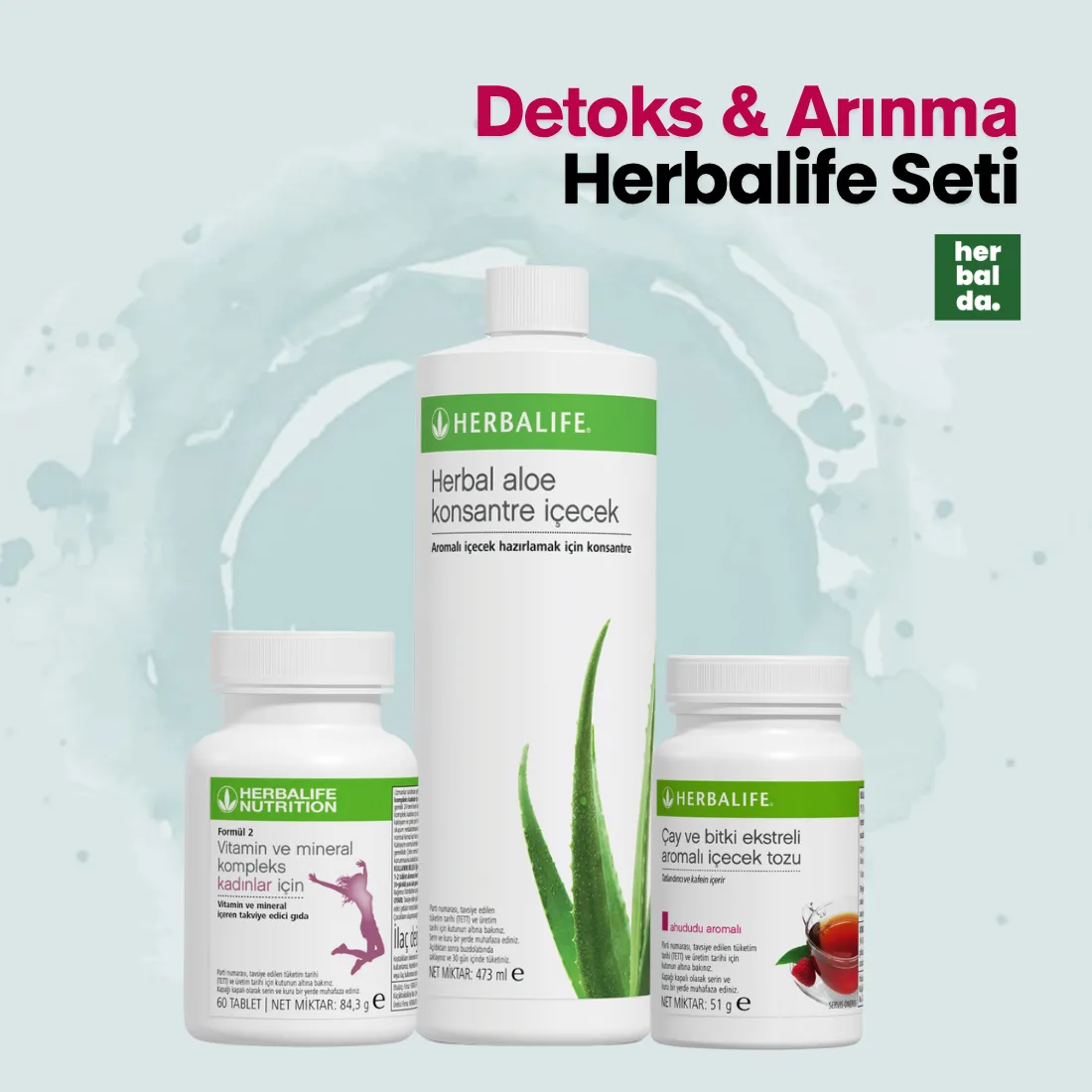 Setin ana parçası olan Herbal Aloe Konsantre İçecek, bağırsak sağlığına destek verirken gün boyu su içimini keyifli hale getirir. Bitki Çayı ise metabolizmayı uyarır, vücuttan ödemin atılmasına ve enerjinin artmasına yardımcı olur.